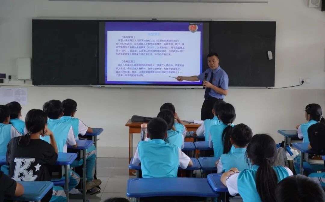 “同学们,如果你遇到他人被欺负,该怎么办?”“什么样的行为属于校园欺凌?”……在课堂上,法治副校长通过一个个贴近学生生活的问题切入,吸引学生关注。课程采用开学宣讲、课堂讲解、互动问答等多种形式,将法律知识融入生动叙事之中,深入浅出、寓教于理。